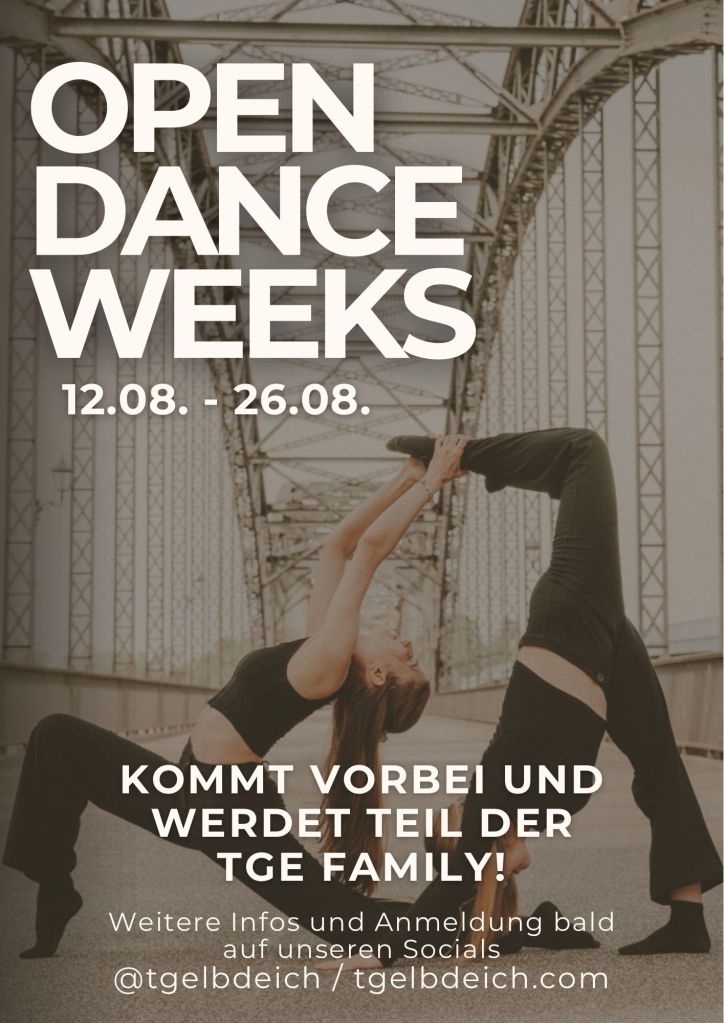 Die kommende Saison verspricht wieder sehr spannend zu werden. Im August geht es für die Tänzer:innen nach der Sommerpause weiter. Die TGE veranstaltet die alljährlichen „Open Dance Weeks“ vom 12. bis 26. August 2024. Dazu sind alle Interessierten herzlich eingeladen, die den Sport gerne einmal ausprobieren möchten oder Interesse an einer Turniermannschaft haben. Auch die Freizeitgruppen für Kinder, Jugendliche und Erwachsene sind Teil des Programms. Die Teilnahme an den „Open Dance Weeks“ ist kostenlos. Weitere Informationen zum Programm und der Anmeldung werden in Kürze auf www.tgelbdeich.com und Social Media (@tgelbdeich) veröffentlicht.