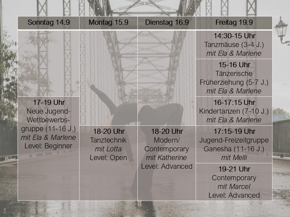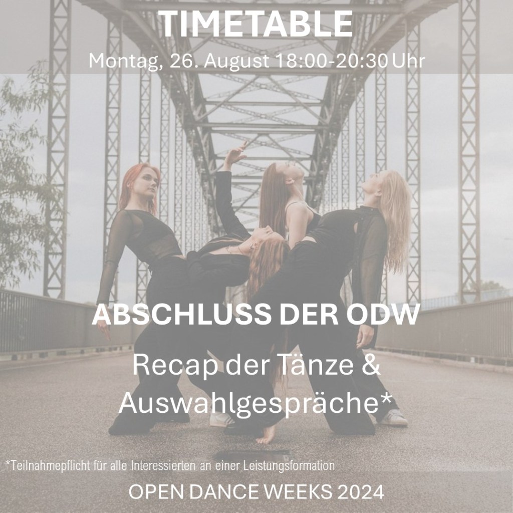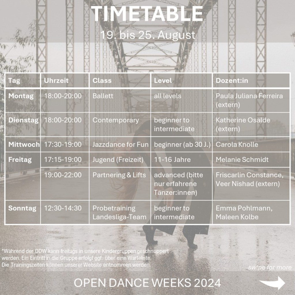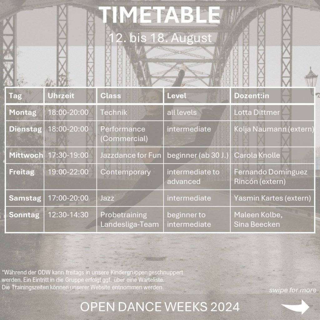 Dann melde dich jetzt für unsere Open Dance Weeks 2024 an. Vom 12. bis 26. August finden bei uns verschiedene Trainings und Workshops in unterschiedlichen Stilen und Levels statt.