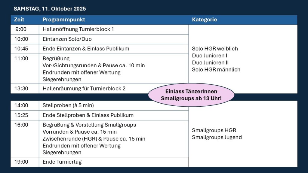 Ort: WinArena, Bürgerweide 7, 21423 Winsen/Luhe Boden: Schwarzer Tanzboden 19,2 x 15m Video: gemäß TSO Musik: gemäß TSO; MP3 an tgelbdeich@yahoo.de (Beschriftung s. unten) Bitte benennt die Datei wie folgt: Kategorie_NameTänzer_Verein (Vorgabe Kategorien-Kürzel s.u.)! Denkt an einen Ersatz-USB-Stick. Kategorien-Kürzel: Solo_HGR_m, Solo_HGR_w, Duo_J1, Duo_J2, SG_J, SG_HGR, Solo_J1_w, Solo_J1_m, Solo_J2_w, Solo_J2_m, Duo_HGR Startgeld: pro Smallgroup 20€, pro Duo 10€, pro SolistIn 5€ (bitte in bar beim Einlass zahlen) Betreuer: pro Smallgroup 2 freie Betreuer, bei Solo/Duo nur ein freier Betreuer pro Verein Parkplatz: BBS Winsen (Luhe), Bürgerweide 20, 21423 Winsen Tickets: Kinder bis 6 Jahre haben freien Eintritt. Es gibt keine weiteren Ermäßigungen! Samstag: Solo HGR & Duo Jugend 10€, Smallgroups HGR & Jugend: 12€, Kombiticket: 20€ Sonntag: Solo Jugend & Duo HGR: 10€