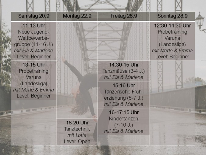 Erwachsene und Jugendliche können jederzeit (außerhalb unserer Sommerpause) in das gemeinsame Techniktraining am Montag oder in die entsprechenden Freizeitgruppen schnuppern! Auch die Kindergruppen können ganzjährig für ein Probetraining besucht werden. Für die Leistungsmannschaften Shakti und Saraswati sowie Varuna kannst du dich während der Open Dance Weeks bewerben.
